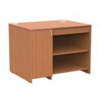Стол изготовлен из ЛДСП класса эмиссии Е1 древесных текстур толщиной 16мм. Поверхность стола облицована химовлагостойким пластиком. Все элементы изделий облицованы ударопрочной кромкой ПВХ 0,4 – 2мм. Оборудован двумя розетками, имеет трёхстоечную конструкцию с тумбой и двумя полками. Под крышкой имеется дополнительная царга для увеличения грузоподъёмности стола.