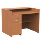 Стол изготовлен из ЛДСП класса эмиссии Е1древесных текстур толщиной 16мм. Поверхность стола облицована химовлагостойким пластиком. Все элементы изделий облицованы ударопрочной кромкой ПВХ 0,4 – 2мм. Стол имеет трёхстоечную конструкцию с тумбой, полкой и двумя ящиками. Дополнительная крышка расположена на уровне крышки демонстрационных столов, а основная – занижена на 125мм.