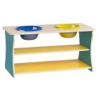 Столешница изготовлена из ЛДСП 16 мм с антибликовым влагостойким покрытием, углы закруглены радиусом 50мм. Кромка ПВХ. Стол позволит детям удобно играть с песком, водой и иными сыпучими и жидкими материалами. Для уборки тазы легко извлекаются, моются и помещаются на прежнее место.