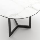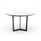 Круглый стол BENZ - отличается своей дизайнерской опорой и изысканной керамической столешницей. Керамическое покрытие стола не боится влаги, устойчиво к перепадам температур, на нем можно резать продукты без использования кухонной доски. Тест с падающей свечой и горящей спичкой также не повредил стол. Рисунок каждой столешницы уникален. Белая с серо-бежевыми прожилками.В хаотичных узорах можно найти разнообразные формы, либо воспринимать их как абстракции. Дизайнерская опора сделана из стали - это долговечный и крепкий материал
