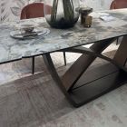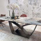 Столешница Двухсторонняя торцевая система раскладывания с двумя независимыми вставками по 50 см, позволяет увеличить длину столешницы на 250 или 300 см при необходимости. Испанская матовая керамика в цвете серо-коричневый мрамор, толщина столешницы 13 мм (3 мм керамика + 10 мм стекло), не царапается, не впитывает загрязнения, термостойкая. Рисунок вставок может не совпадать и не являться продолжением рисунка основной столешницы. Каркас Рама стола - металл, цвет – черный. Основание стола - металл, цвет – медный брашированный.
