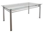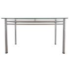 Обеденный стол с металлическими опорами Опоры стола надежно крепятся к столешнице стальными пятаками на уф склейке Подходит в современные интерьеры кухонь, кафе Стекло и хром выглядят воздушно и легко, не смотря на массивность изделия, эти материалы очень гигиеничны МАТЕРИАЛЫ: стекло 10мм, опоры - металлик УПАКОВКА: 83х143х4см, 93х85х6см, 16х136х3см, 3 места ВЕС: 40 кг Цвет: металлик
