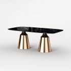 Коллекция обеденных столов Lucas - одна из самых популярных. Включает в себя различные варианты и формы обеденных столов, для персонализации своей собственной дизайнерской столовой. Основание состоит из центрального конусного ствола, выполненного из нержавеющей стали, массивный внешний вид которого облегчается металлическим покрытием нитрид титана цвет золото и соединением с узкой и отступающей столешницей, как бы напоминающей длинную элегантную шею, поддерживающую столешницу. Коллекция включает круглый, овальный, прямоугольный керамический стол Lucas с матовым или глянцевым покрытием и версию со столешницей из шпона. Столешница выполнена из МДФ 19 мм, керамика толщиной 6 мм. Ее органический и натуральный внешний вид подчеркивает путь бренда к экологичному дизайну, который создается из натуральных материалов с использованием методов с низким энергопотреблением.