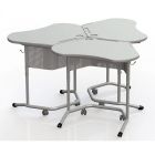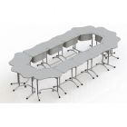 При производстве стола трапеция мы используем пластиковые столешницы - толщина пластика 25 мм. Стол может составляться в разные конфигурации. В столешницах есть углубления для ручки и кружки, и эргономичный вырез со стороны ученика. Легко удалить надписи учеников влажной салфеткой. Металлический каркас сделан из электросварной трубы толщиной стенки 1,5 мм. Перфорированный экран имеет рисунок «колокольчик». Трапециевидный стол ШСТ17 имеет безопасную регулировку по высоте: 3-5, 4-6, 5-7 гр. роста и 2 колёсных опоры со стопором.