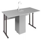 Стол изготовлен на металлокаркасе из тонкостенных стальных труб с применением ЛДСП класса эмиссии Е1 древесных текстур, толщиной 16мм. Поверхность стола облицована химовлагостойким пластиком. Края крышки закруглены радиусом 30мм. Элементы стола из ЛДСП облицованы ударопрочной кромкой ПВХ 0,4-2мм. Крепление царги к каркасу с помощью евровинтов 7х70мм. Крышка крепится к каркасу винтами М6 через металлические футорки, что обеспечивает столу гладкую поверхность. К крышке снизу при помощи эксцентриковых стяжек крепится тумба для сантехники, собранная на евровинтах 7х50мм. Стол комплектуется пластиковой мини-раковиной, моносмесителем и гофротрубой для монтажа слива.