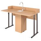 Стол изготовлен на металлокаркасе из тонкостенных стальных труб с применением ЛДСП класса эмиссии Е1 древесных текстур, толщиной 16мм. Поверхность стола облицована химовлагостойким пластиком. Края крышки закруглены радиусом 30мм. Элементы стола из ЛДСП облицованы ударопрочной кромкой ПВХ 0,4-2мм. Крепление царги к каркасу с помощью евровинтов 7х70мм. Крышка крепится к каркасу винтами М6 через металлические футорки, что обеспечивает столу гладкую поверхность. К крышке снизу при помощи эксцентриковых стяжек крепится тумба для сантехники, собранная на евровинтах 7х50мм. Стол комплектуется пластиковой мини-раковиной, моносмесителем и гофротрубой для монтажа слива.