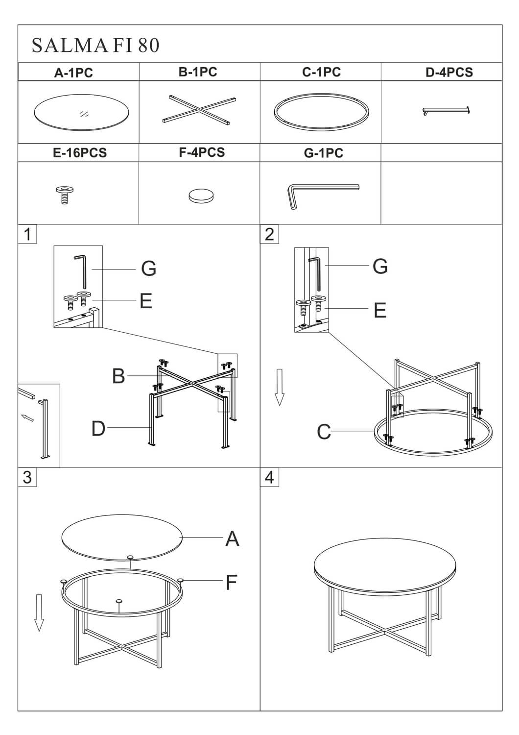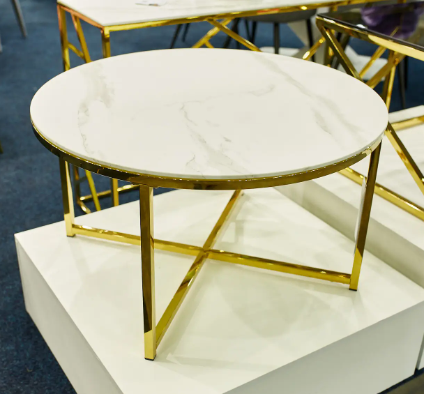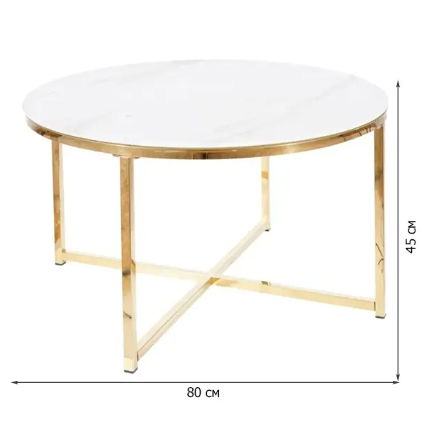 Вес, кг: 13 / Высота (см): 45 / Гарантия, мес.: 12 / Глубина (см): 80 / Количество коробок: 1 / Материал каркаса: металл / Материал столешницы: стекло / Необходимость сборки: да / Раздвижной: нет / Размер упаковки 1: 0,85/0,89/0,135 / Страна производитель: Китай / Форма столешницы: круг / Цвет каркаса: золото / Цвет столешницы: белый / Ширина (см): 80