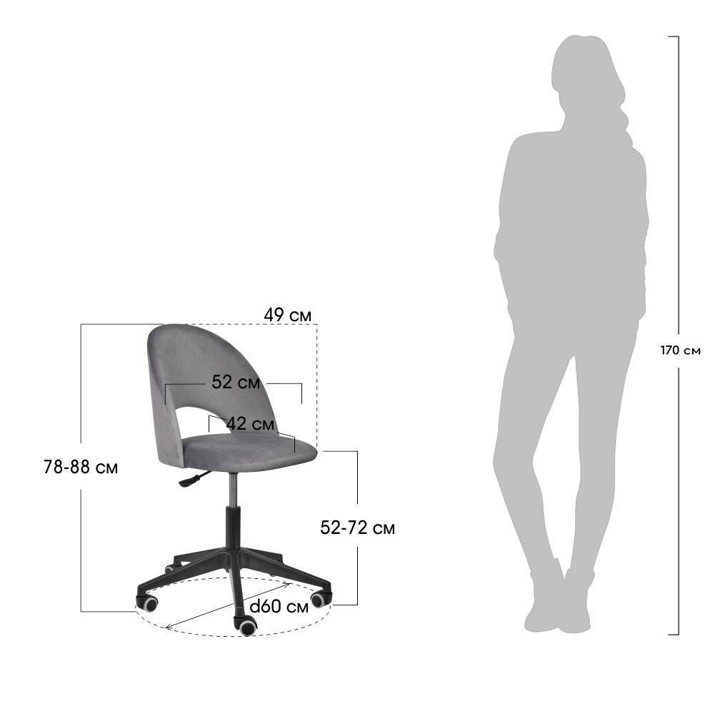 Мягкий компьютерный стул на пятилучье. Обивка из износостойкого мебельного велюра устойчива к истиранию. Размер: 49x52x78-88см Глубина сиденья 44 см. Высота сиденья 42-52 см. Диаметр крестовины 60 см. Вес стула 7 кг. Максимальная нагрузка 120 кг. Поставляется в разобранном виде.