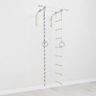Благодаря металлическому каркасу и прочной настенной фиксации, турник устойчив и надежен. Конструкция выдерживает нагрузку до 100кг, это позволяет заниматься на турнике всей семье. Максимальный объем нагрузки на детское навесное оборудование составляет 50 кг.