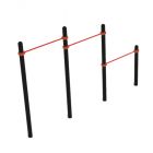 Тройной турник представляет собой конструкцию, состоящую из четырех вертикальных опорных столбов из круглопрофильной трубы, на которые устанавливаются - перекладины изготовленные из круглопрофильной трубы. Фиксация всех навесных на стойки элементов происходит с помощью стальных хомутов. Сварные швы всех элементов изделия тщательно обработаны и зачищены. Поверхность всех элементов изделия окрашена порошковым напылением в электростатическом поле. Вертикальные столбы бетонируются в грунт. Во все внешние отверстия труб турника - установлены пластиковые заглушки. Турник поставляется разобранном виде.