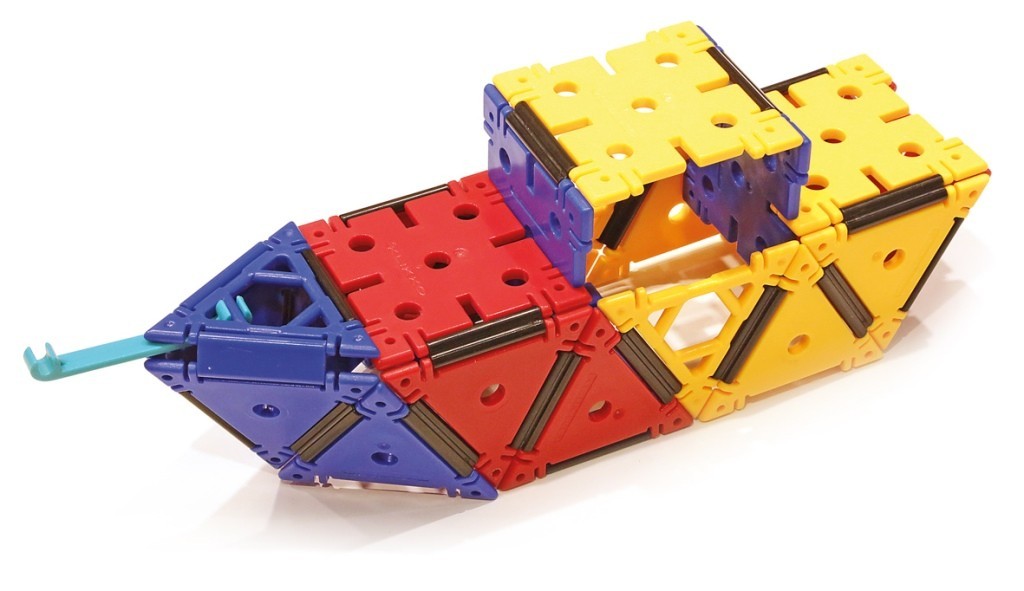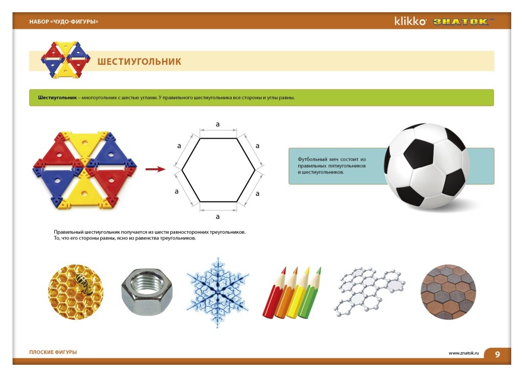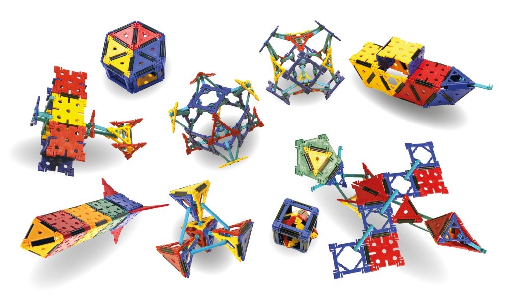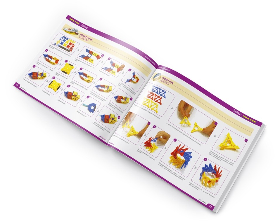 Набор содержит 102 детали и красочную инструкцию с подробным описанием сборки 43 проектов. В инструкции можно будет найти и образовательную часть, знакомящую ребёнка с основами геометрии. Инструкция состоит из четырех разделов, от простого к сложному: «Плоские фигуры», «Объемные фигуры», «Фигуры трансформеры» и «Арт-фигуры».