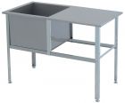 Ванна моечная с рабочей поверхностью, сварная выполнена из нержавеющей стали марки AISI430. Борт по периметру ванны составляет 50мм. Стол является прямым продолжением ванны и усилен снизу П-образным профилем. Каркас разборный выполнен из оцинкованной стали. Стойки каркаса представляют собой уголок с фальцованными краями для увеличения жесткости конструкции. Опорные ножки регулируются по высоте и изготовлены из нержавеющей стали c пластиковой подложкой внизу для предотвращения повреждения напольного покрытия. В комплект поставки ванны не входит система разрыва струи.