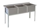 Ванна моечная трехсекционная, сварная выполнена из нержавеющей стали марки AISI430. Борт по периметру ванны составляет 50мм. Борт ванны, обращенный к стене, имеет отверстие под смеситель. Пристенный борт высотой 50 мм. Каркас разборный выполнен из оцинкованной стали. Стойки каркаса представляют собой уголок с фальцованными краями для увеличения жесткости конструкции. Опорные ножки регулируются по высоте и изготовлены из нержавеющей стали c пластиковой подложкой внизу для предотвращения повреждения напольного покрытия. В комплект поставки ванны не входит система разрыва струи.