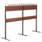 Вешало изготавливается на металлокаркасе из тонкостенного электросварного профиля, соединенном панелями из ЛДСП класса эмиссии Е1 толщиной 22 мм. На панелях крепятся 32 металлических крючка для одежды и 32 металлических крючка для сумок и пакетов. Металлокаркас представляет собой три отдельных опоры, основание которых изготавливается из профиля 40х25х1,5 мм и двух стоек из профиля 20х20х1,5 мм.